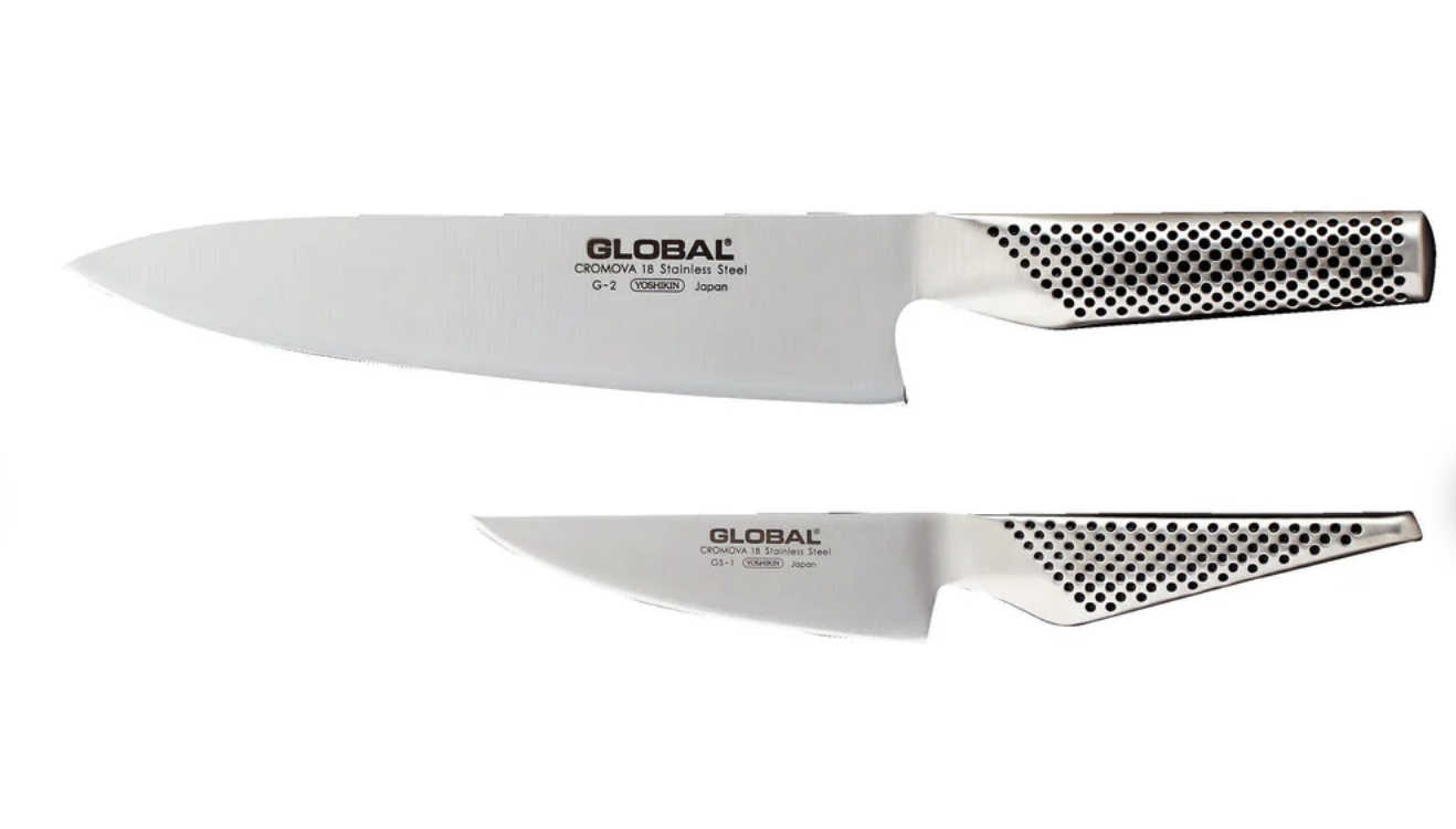 De G201 messenset van Global bestaat uit een koksmes en een groentemes die zorgen dat u altijd het juiste gereedschap bij de hand hebt als u wilt gaan snijden. Deze messen zijn gemaakt van Cromova staal waardoor ze erg lang mee gaan, roestvast zijn en erg scherp te slijpen zijn. Dit betekent dat u nog jaren scherp kunt snijden met deze messen. Het reliëf op de handgrepen zorgt dat u altijd een optimale controle zult hebben over deze messen.