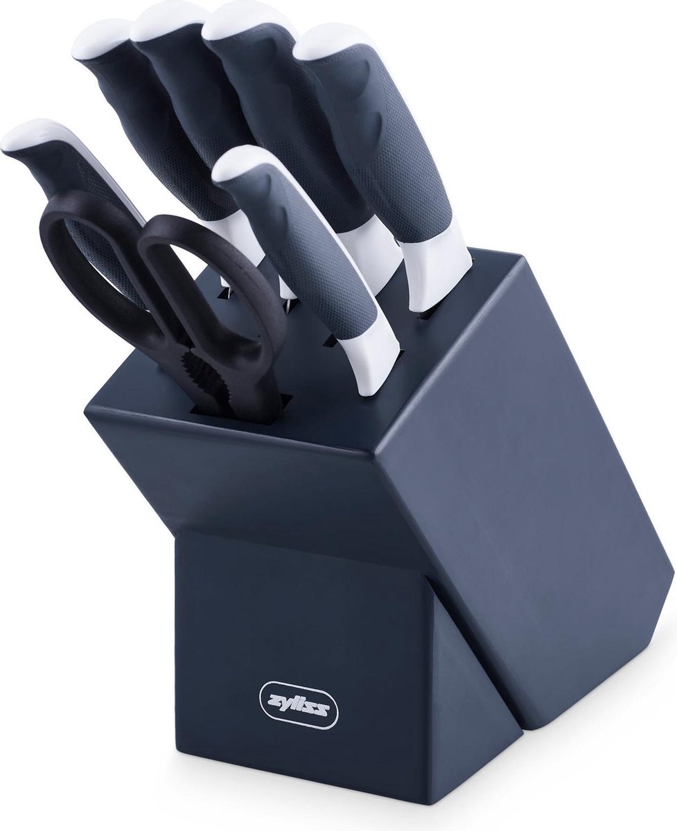 Dit 7-delige Comfort Messenblok van Zyliss bevat alle messen die je dagelijks nodig hebt in de keuken. Het donkergrijs houten blok heeft een sober design dat bij alle stijlen van keukens past. Het is voorzien van antislipvoetjes voor perfecte stabiliteit bij het gebruik. Alle messen hebben een ergonomische greep die speciaal ontworpen werd voor extra comfort en perfect in de hand ligt. De vingerinkeping bovenop de greep zorgt voor een comfortabele positie om de wijsvinger te plaatsen bij nauwkeurig snijden. Alle messen zijn vaatwasmachinebestendig en kunnen na gebruik eenvoudig in de vaatwasmachine schoongemaakt worden. Dit messenblok komt met 5 jaar fabrieksgarantie.